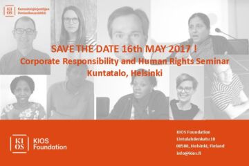 KIOS Spring Seminar CORPORATE RESPONSIBILITY AND HUMAN RIGHTS Time: Tuesday, MAY 16 th 2017, at 8:15–15:45 Place: Kuntatalo, Toinen Linja 14, 00530 Helsinki Registration open until Friday 5th of May. Corporates have an essential role in making equality, human rights and sustainable development a reality. Corporate Responsibility is at the heart of Finland’s development policy […]