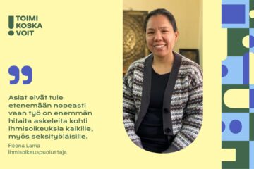 Reena Lama on nepalilainen ihmisoikeuspuolustaja, joka edistää seksityöläisten oikeuksia Nepalissa. Haastattelimme Reenaa seksityöläisten tilanteesta Nepalissa ja millaista rohkeutta seksityöläisten ihmisoikeuksien puolustaminen Nepalissa vaatii. Reena Lama toimii perustamansa Friends Affected and Infected Together in Hand (FAITH)- kansalaisjärjestön toiminnanjohtajana. KIOSin tukemana FAITH puolustaa seksityöläisten oikeuksia. Reena kertoo, että tällä hetkellä Nepalissa seksityöhön liittyvä lainsäädäntö johtaa seksityöläisten marginalisoitumiseen […]
